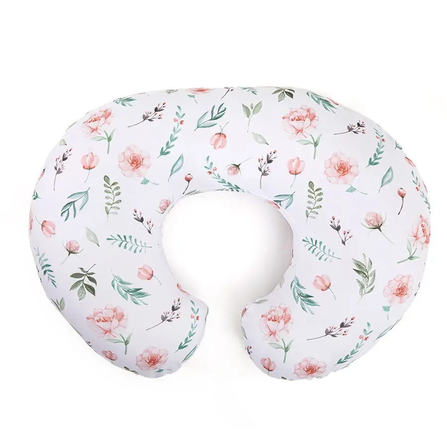 L’image présente un coussin d’allaitement au design fleuri rose et blanc, idéal pour les moments de douceur et de complicité avec votre enfant.